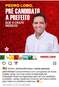 O vereador Pedro Lobo (PT) continua firme na estratégia para se viabilizar na disputa pela Prefeitura do Crato. Nesta quarta-feira, 31, o vereador usou suas redes sociais para reafirmar sua pré-candidatura a prefeito. Na postagem, Pedro se diz comprometido com a cidade e que estava com o nome à disposição da federação (PT, PCdoB e PV) para ajudar a “construir um futuro melhor para todos os cidadãos cretenses”.